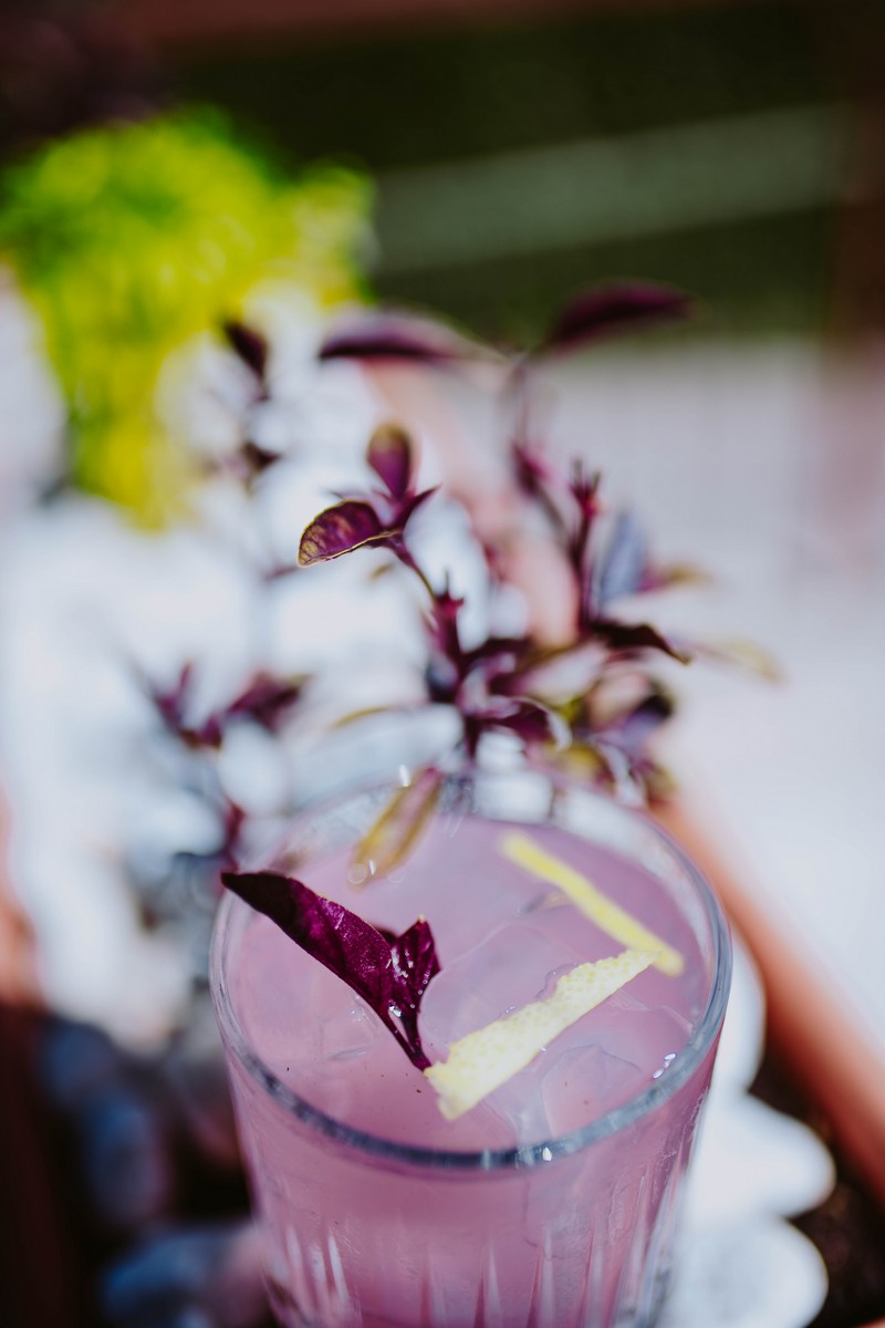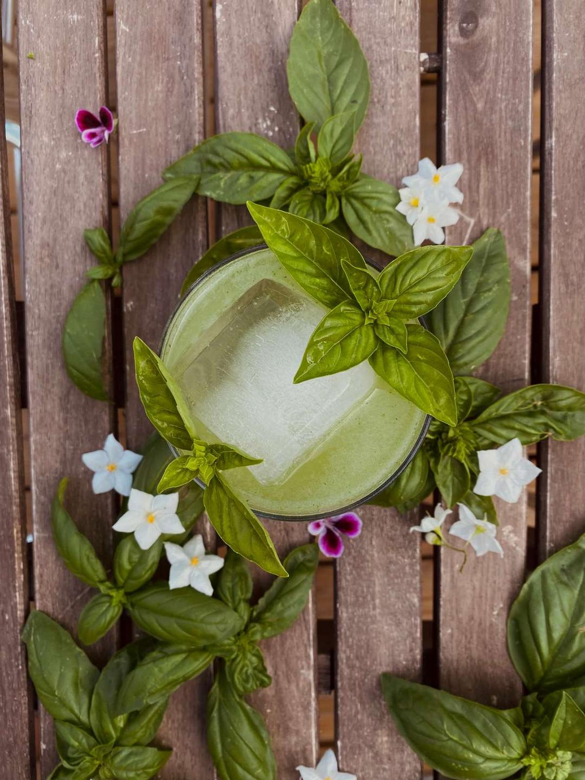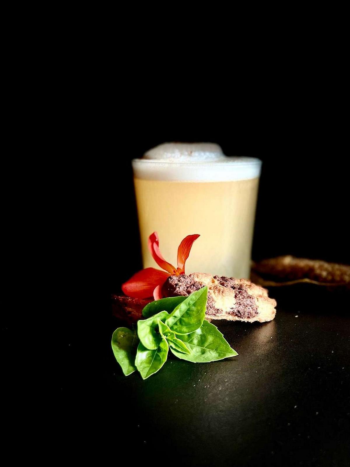 GIN BASIL SMASH 2.0 : cocktail a base di gin locale, basilico metro 0 , miscela di nostra produzione di camomilla e limoni km0.